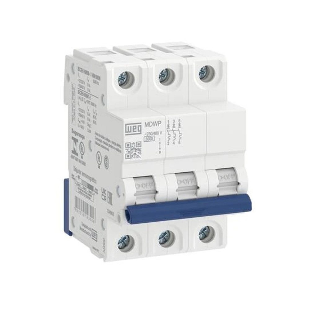 – O Disjuntor Din Tripolar 3x10A 3ka Curva C da WEG Possui os contatos fabricados em Alumínio, a chave de isolamento e carcaça em PVC anti chamas e Bobina com núcleo magnético (eletroímã).